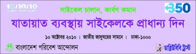 বায়ুমন্ডলে কার্বণের মাত্রা ৩৫০ এ নামিয়ে আনতে আগামী ১০ অক্টোবর বিশ্বের প্রায় ১৮৮টি দেশ বিভিন্নভাবে তাদেন দাবি জানিয়ে অনুষ্ঠান আয়োজন করেছন। অন্যন্যা দেশের ন্যায় ঢাকায় বাংলাদেশ পরিবেশ আন্দোলন (বাপা) এবং ডাব্লিউবিবি ট্রাস্ট যৌথভাবে সাইকেল চালন, কাবর্ণ কমাতে- যাতায়াত ব্যবস্থায় সাইকেলকে প্রাধান্য দিন শিরোনামে সাইকেল শোভাযাত্রার আয়োজন করেছে। আগামীকাল সকাল ১১ টায় জাতীয় জাদুঘরের সামনে থেকে শোভাযাত্রাটি শুরু হয়ে জাতীয় প্রেমক্লাবে গিয়ে শেষ হবে।