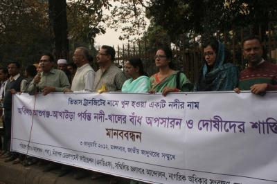 তিতাস নদীসহ আশুগঞ্জ-আখাউড়া পর্যন্ত ১৮টি নদী ও খালের উপর বাঁধ অপসারণ এবং নদী-পানিসম্পদ-মানুষের জীবনজীকিকা ধবংশকারী এই বাঁধ নির্মাণকারী ও সহায়তাকারীদের শাস্তি দিতে হবে। আজ সকাল ১১ টায় জাতীয় জাদুঘরের সামনে পরিবেশবাদী সংগঠন পরিবেশ বাঁচাও আন্দোলন (পবা) , নিরাপদ ডেভলপমেন্ট ফাউন্ডেশন (এনডিএফ), সম্মিলিত জলাধার আন্দোলন, নাগরিক অধিকার সংরণ ফোরাম (নাসফ), রিভারাইন পিপল আয়োজিত এক মানববন্ধনে বক্তারা এই অভিমত ব্যক্ত করেন।