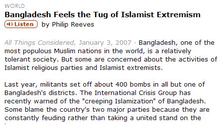 সমপ্রতি এনপিআর নিউজে বাংলাদেশের মৌলবাদের বিস্তৃতি নিয়ে একটি প্রতিবেদন শুনলাম। জানুয়ারীর 3 তারিখে প্রচারিত ফিলিপ রীভসের প্রতিবেদনে [link|http://www.npr.org/templates/dmg/dmg.php?prgCode=ATC&showDate=03-Jan-2007&segNum=15&mediaPref=RM&getUnderwriting=1|evsjv বাকিটুকু পড়ুন