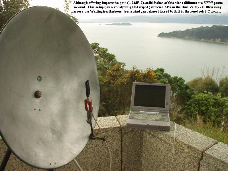 ু Make 2.4GHz parabolic mesh dishes from cheap but sturdy Chinese cookware scoops & a USB WiFi adaptor ! The largest (300mm diam) shows 12-15dB gain (enough for a LOS range extension to 3-5km), costs ~US$5 & comes with a user friendly bamboo handle that suits WLAN fieldwork