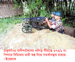 ঠাকুরগাঁওয়ের ধর্মগড় সীমান্তে এক বাংলাদেশী কৃষক ও বিডিআরের পাল্টা গুলিতে বিএসএফ-এর 2 সদস্য বাংলাদেশ ভূখণ্ডের অভ্যন্তরে নিহত হয়েছে। গতকাল মঙ্গলবার সকাল থেকেই সেখানে বিএসএফ-এর আকস্মিক গুলিবর্ষণে যুদ্ধ পরিস্থিতি বিরাজ করছে। এ যাবৎ বিএসএফ-বিডিআরের মধ্যে 5 হাজার রাউন্ড গুলি বিনিময় হয়েছে। প্রাণ বাঁচাতে 4টি গ্রামের লোক বাড়ি-ঘর ছেড়ে পালিয়েছে।