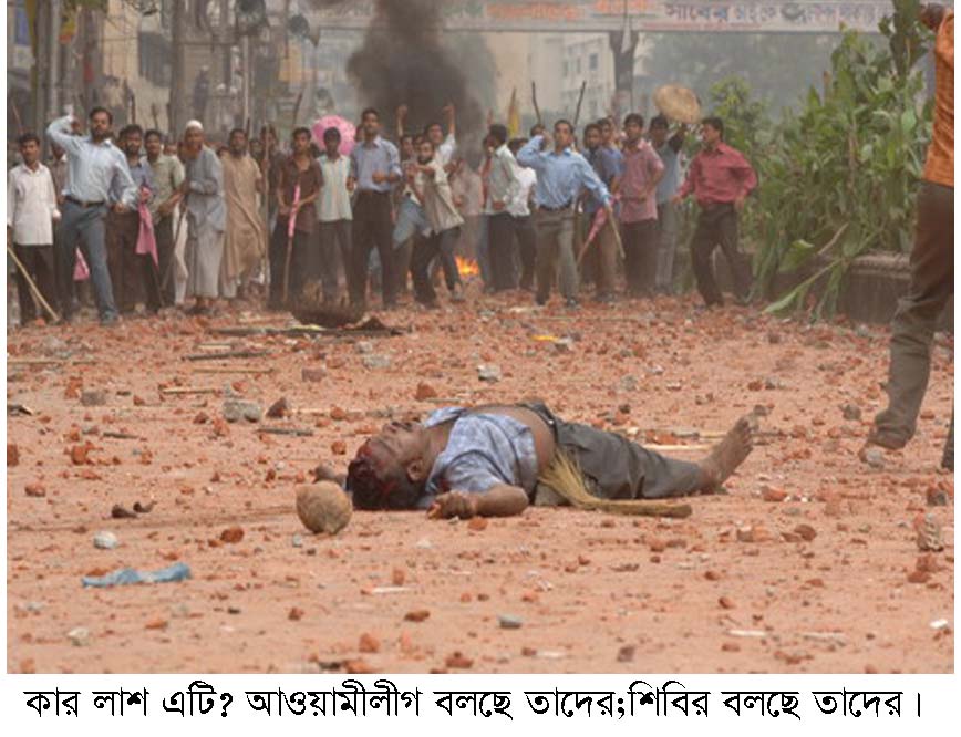 একটি লাশ পড়ে আছে রাজপথে। রাজপথে চলছে ক্ষমতার কাড়াকাড়িতে টিকে থাকার লড়াই। আর এ লড়াইয়ের বিরতিতে এই লাশটি নিয়ে আওয়ামীলীগ এবং ইসলামী ছাত্রশিবির করছে রাজনীতি চাঙ্গা করার রাজনীতি। দুদলই এই লাশটি তাদের দলীয় লাশ বলে পোস্টার সাটিয়েছে দেয়ালে দেয়ালে। চিন্তা করে দেখুন 'দলীয় লাশ'! লাশটি যে একটি মানুষের তা কেউই... বাকিটুকু পড়ুন