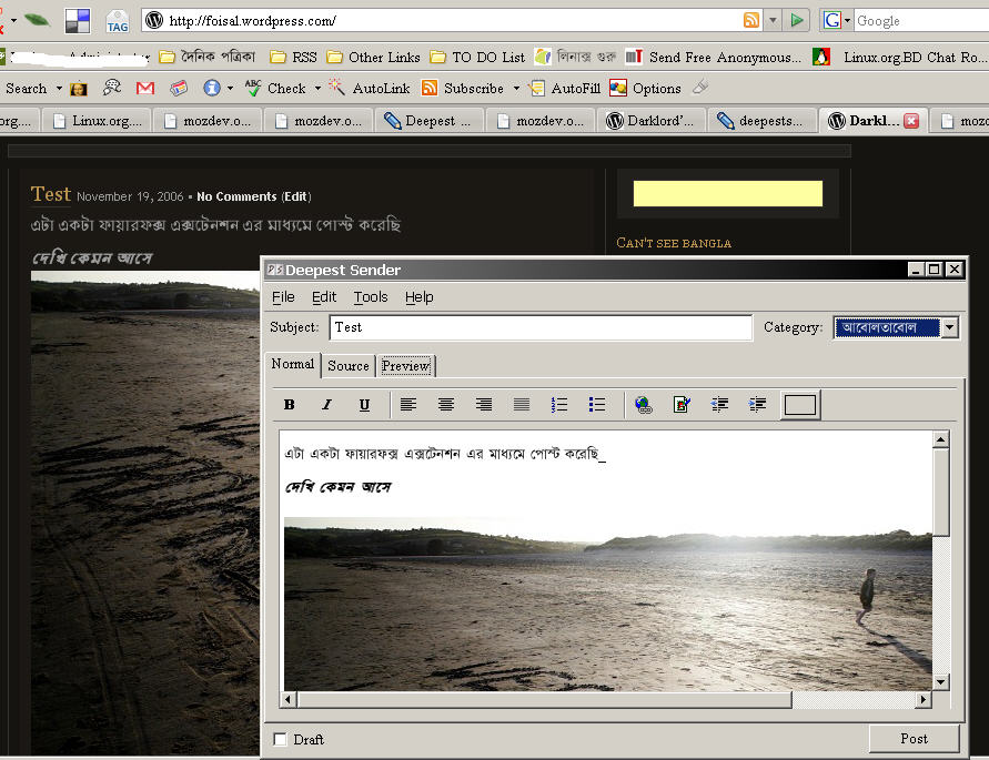 একটা ফায়ারফক্স এক্সটেনশন পেলাম । এর মাধ্যমে আপনার ব্লগে লগইন না করেই এই এক্সটেনশন বাপ্লাগইনের মাধ্যমে সরাসরী ব্লগ পোস্ট করা যাবে !@@!205612