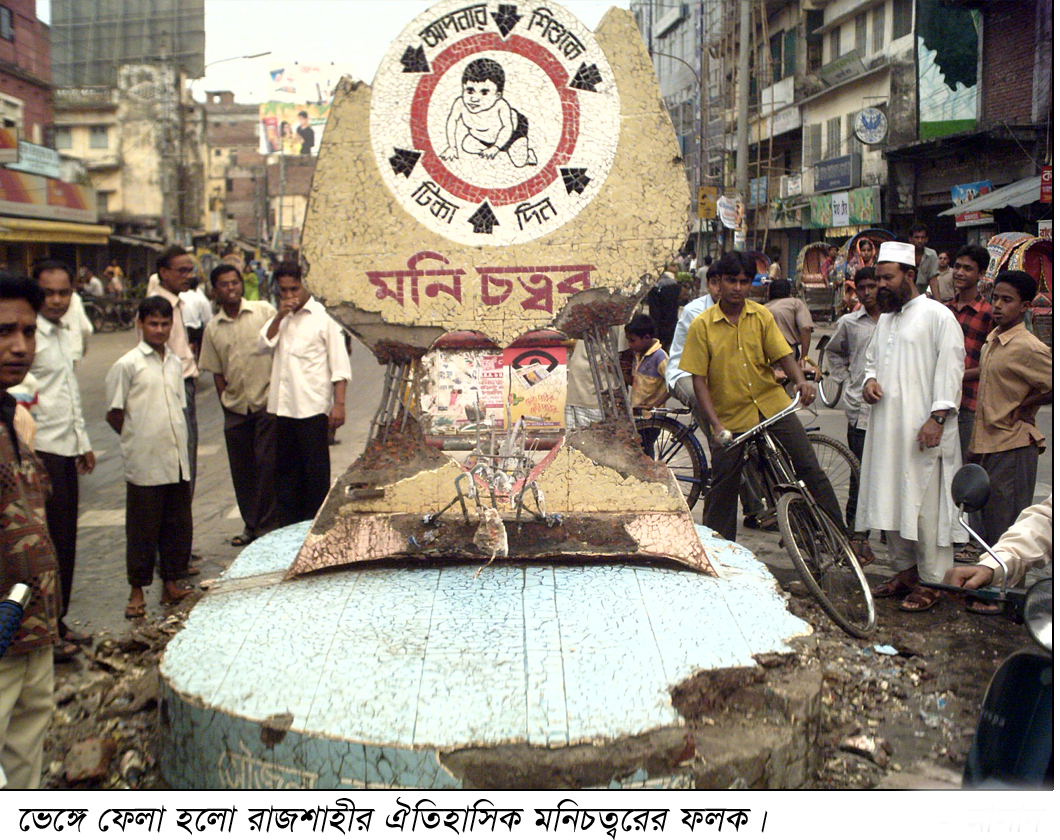রাজশাহীর সোনাদিঘীর মোড়ের মু্যরালটিকেই ঘিরেই আশপাশের এলাকাটি মনিচত্বর নামে পরিচিত। নগরীর সৌন্দর্য বর্ধনের নামে গতকাল ভেঙ্গে ফেলা হয়েছে প্রায় একযুগ আগে তৈরি এই মু্যরালের একাংশ। স্থানীয় জনতার বাধার মুখে ভাঙ্গার কাজ বন্ধ হলেও শেষ রা হয় নি।
