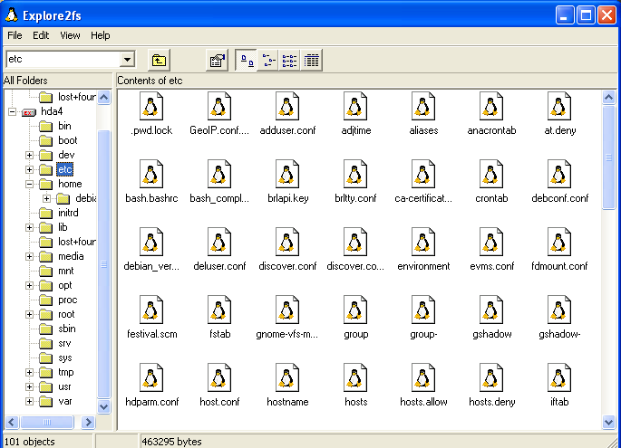 Explore2fs is a GUI explorer tool for accessing ext2 and ext3 filesystems. It runs under all versions of windows and can read almost any ext2 and ext3 filesystem.