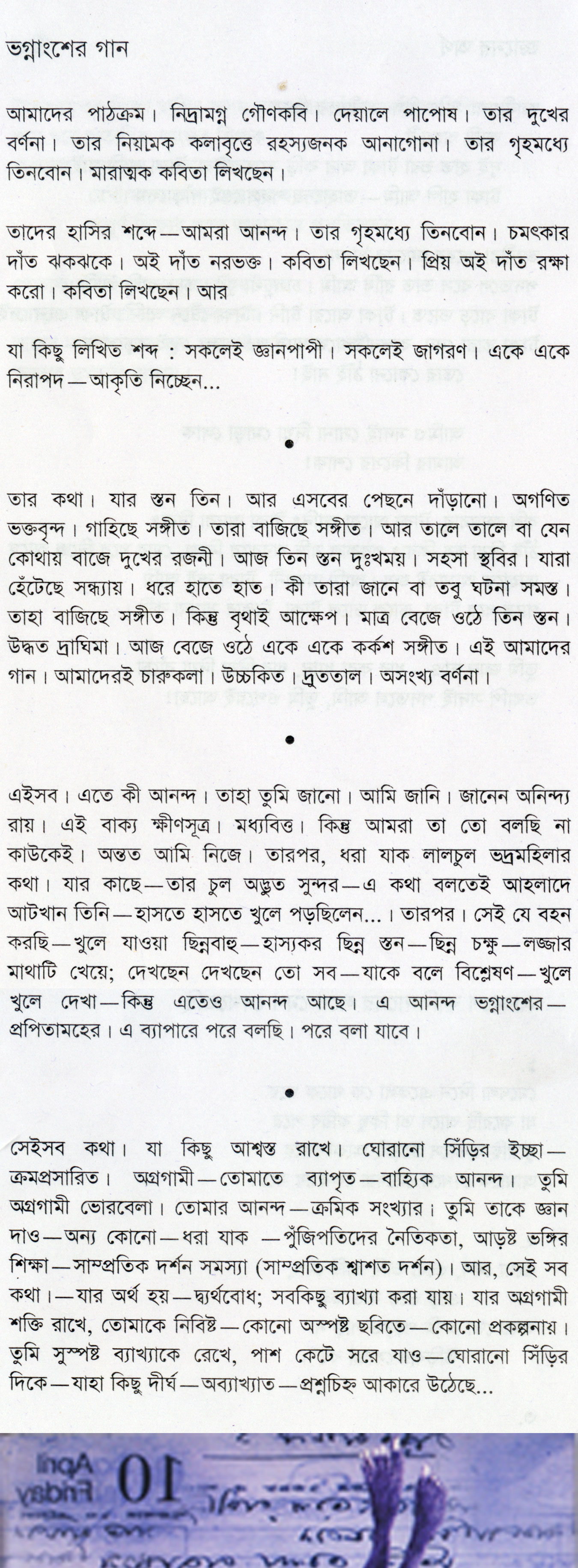 কবিতার কোন ব্যবহার্যতা কোনকালেই সেভাবে ছিলনা। বিশেষত বাস্তবতাকে মোকাবিলার উপায় হিসেবে। আমার কাছে সহস্র রাজনীতিবিদগণের চাইতে একটি কবিতা বেশি কাছের। আমি নিশ্চিতভাবেই ব্যার্থমানুষ, সেটা যেমন রাজনীতিতে তেমনি বাস্তবতাতেও। তাই বাকি রইল কবিতা; ইদানিং দেখতে ইচ্ছে করে সেটি কিভাবে আমাকে ব্যর্থ করে তুলবে।