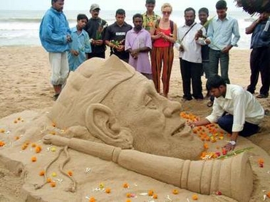 [রং=ৎবফ]শিল্পী সূদর্শন বালি নির্মিত বিসমিল্লাহ খাঁর অবয়বরূপের শেষ ফিনিশিং দেয়ার জন্য হাত বুলাচ্ছেন। ছবিটি ভারতের গোলেডন বিচ নামে খ্যাত পূরীতে ধারণ করা হয়েছে গত 21 শে আগস্ট। ছবিঃ সঞ্জীব মূখাজর্ী, রয়টার্স [/রং]