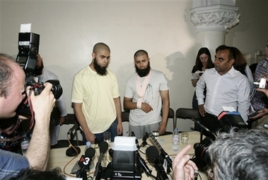 Members of the media surround Mohammed Abdul Kahar, 23, right, who was shot by British police during an anti-terrorist raid in their family house June 2, accompanied by his brother Abul Koyair, 20, left, following a news conference, in east London, Tuesday June 13, 2006. Both were interrogated for a... বাকিটুকু পড়ুন