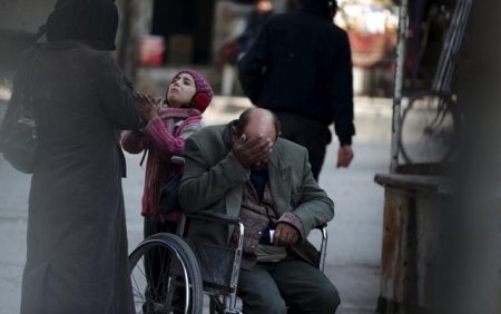 সিরিয়ার দুমা। হুইলচেয়ারে বসা বাবার চিকিৎসার জন্য অর্থ যোগাড় করতে মেয়ের মরিয়া চেষ্টা।