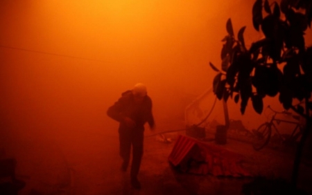 সিরিয়ার দুমা। ২৩ নভেম্বর বিমান হামলার মধ্যে প্রাণ বাঁচাতে ছুটছেন এক সিভিল ডিফেন্স সদস্য।