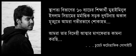 ২০১১ সাল ,একটি ছেলে সকল পরীক্ষায় উত্তীর্ণ হয়ে এসেছিল আর্কিটেক হওয়ায় স্বপ্ন নিয়ে। সে যথাযথ ভাবেই সকল প্রজেক্ট, এক্সাম শেষ করল। তার পিতামাতাও একই স্বপ্ন দেখে কবে তার ছেলে একজন সফল ইঞ্জিনিয়ার হয়ে ঘরে ফিরবে সেই আশায় পথ চেয়ে থাকে। কিন্তু তা আর হল না। গত ২৯.০৩.২০১৬ ছেলেটি টিউশনি করার জন্য সিএনজি করে যাচ্ছিল। কিছু সময় পর সেই সিএনজি এক্সসিডেন্ট করল,এবং তার সব স্বপ্ন রাস্তার রক্তের সাথেই মিশে গেল।