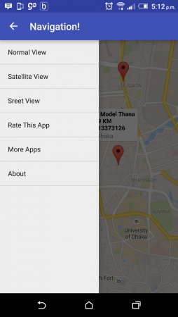 Yes বাটনে ক্লিক করলে আপনার ফোনের GPS enable হয়ে যাবে। আর অ্যাপটি সরাসরি আপনার বর্তমান Location সহ নিকস্থ থানা ও র্যাব অফিসগুলোর অবস্থান সহ ফোন নাম্বারগুলো দেখিয়ে দিবে ঠিক নিচের ছবিটির মত করে।