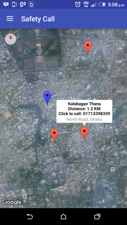 এখানে নীল রঙের মার্কারটা হচ্ছে ব্যবহারকারীর অবস্থান আর লাল মার্কারগুলো হচ্ছে নিকস্থ থানা ও র্যাব অফিসগুলোর অবস্থান। প্রত্যেকটি সাদা মার্কার window তে থানার নাম, আপনার অবস্থান থেকে থানার দূরত্ব, থানার ওসির ফোন নাম্বার, এবং থানার ঠিকানা দেখাবে। এখন কেবল Click to call লেখা সাদা window টার উপর ক্লিক করলেই কল চলে যাবে ওই থানার ওসির কাছে। অ্যাপটিতে দেয়া প্রত্যেকটি ফোন নাম্বারই ভেরিফাই করা পুলিশ ও র্যাবের নিজস্ব ওয়েব সাইট থেকে নেয়া।